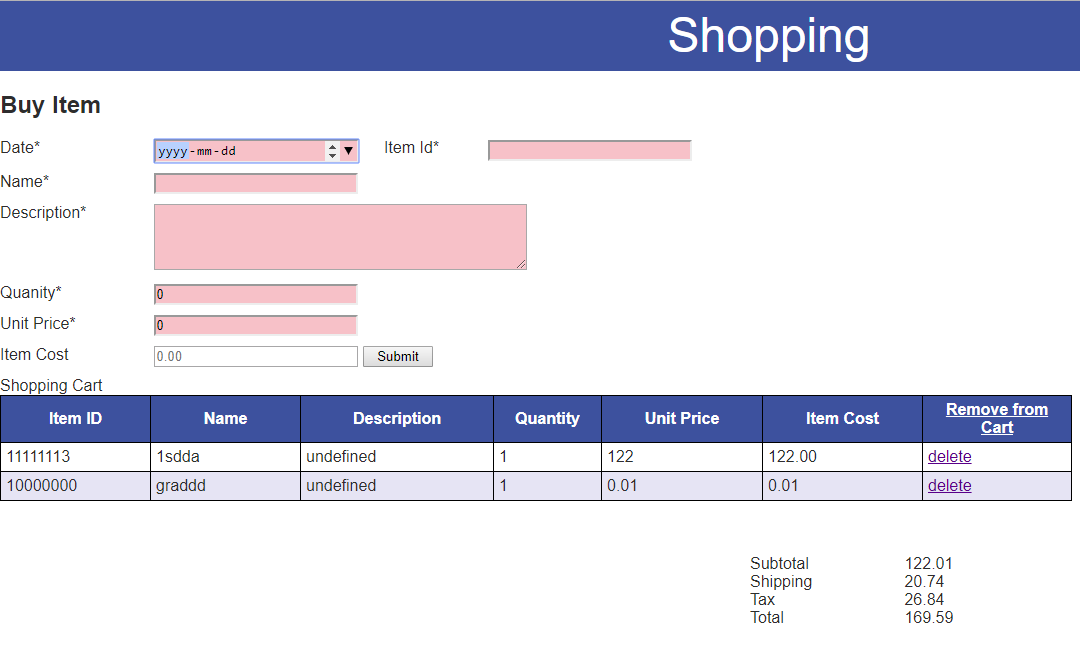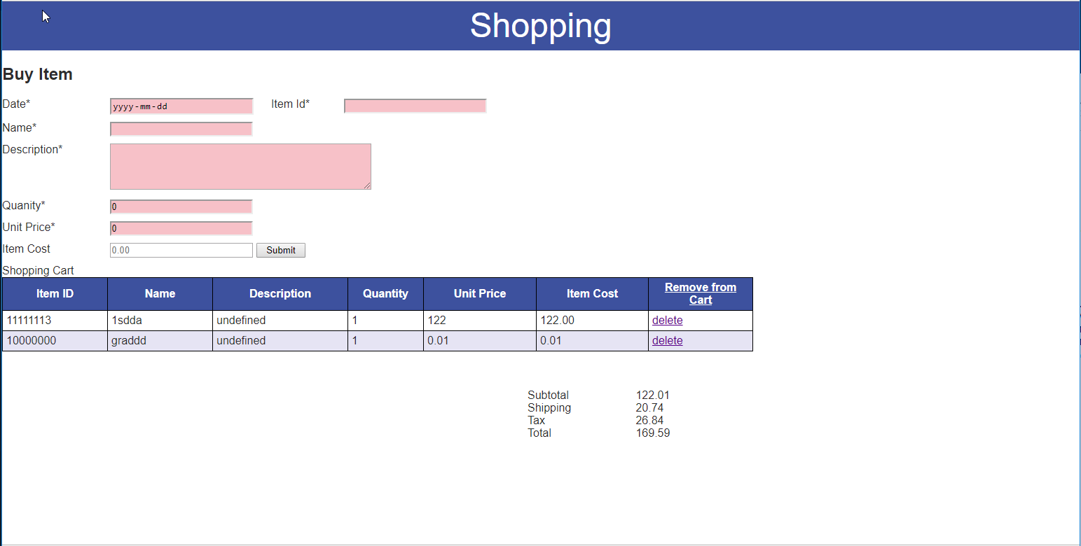 Application Break Down: This application consists of a 'Buy Item' input form that is used by the user to input their purchases. This form interacts with the Shopping table listing. When the submit button is pressed, which is used to list the items in the shopping cart. The user also has the ability to delete items from the shopping cart. The website can be closed and re-opened again, in the same browser, and the items will remain. The item list is stored locally.